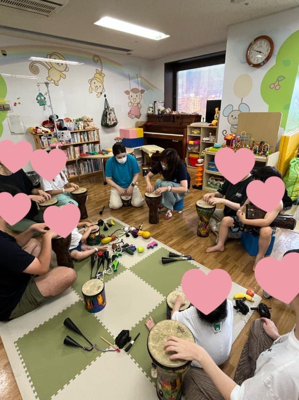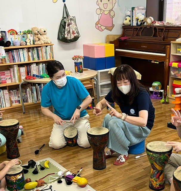 小さな楽器でリズムをストップしたり、みんなで揃えて1回だけ鳴らす、2回だけ叩くなど、タイミングを合わせることができるようになると、今度はジャンベというタイコに挑戦。リズムのまねっこ遊びをしたり、大きくしたり小さく鳴らしたりと、あっという間にプレイルームは色んな音があふれてきて、楽しい時間を過ごすことができました。