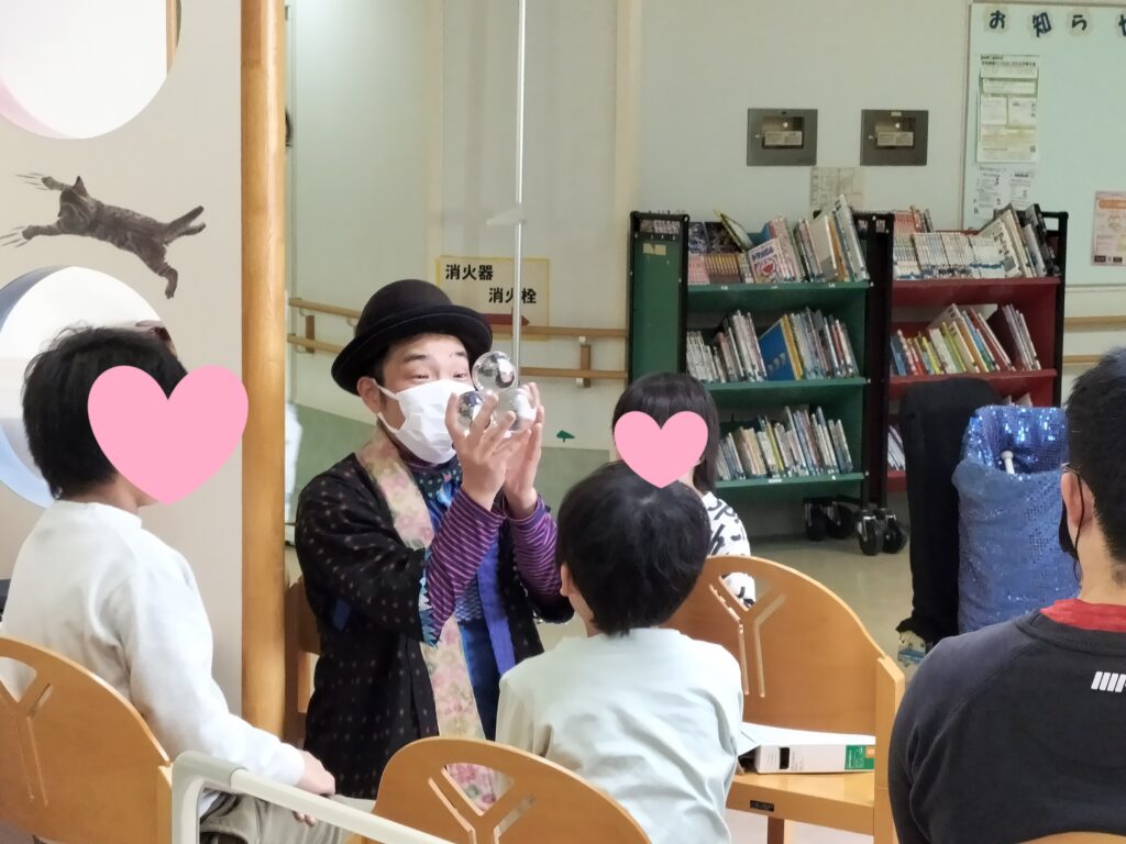 技が決まるたびに、前で見ていた男の子が「ウソでしょ?!」と大きな声で反応してくれました。クリスタルボールのときに、真ん中にいた男の子にお手伝いをしてもらったところ成功!、思いのほか「いいなー」というような声があがり、「じゃあ、今のをやってみたい人?」と聞いたら3人くらい元気に手が上がったので、みんなにもチャレンジしてもらいました。