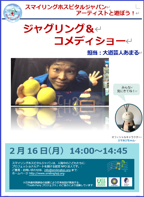 鳥のパペットを使ったオリジナルの曲芸ショー(フラミンゴ&タゲリ&メジロのけん玉パフォーマンス、カワセミパペットを使った創作パフォーマンスなど)、クリスタルボールのコンタクトジャグリング、バウンスボールジャグリングや飛行機のバランス芸を行いました。