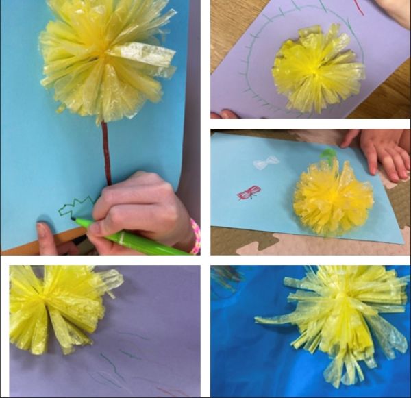 ビニールテープを使った「たんぽぽ制作」では、個性豊かな作品が出来上がりました。親御さんも子どもたちそれぞれのセンスに感心している様子でした。