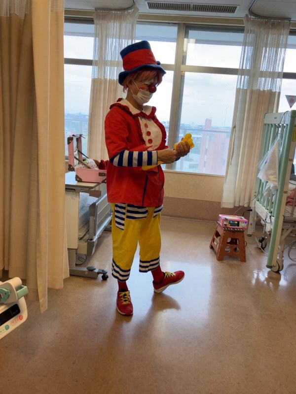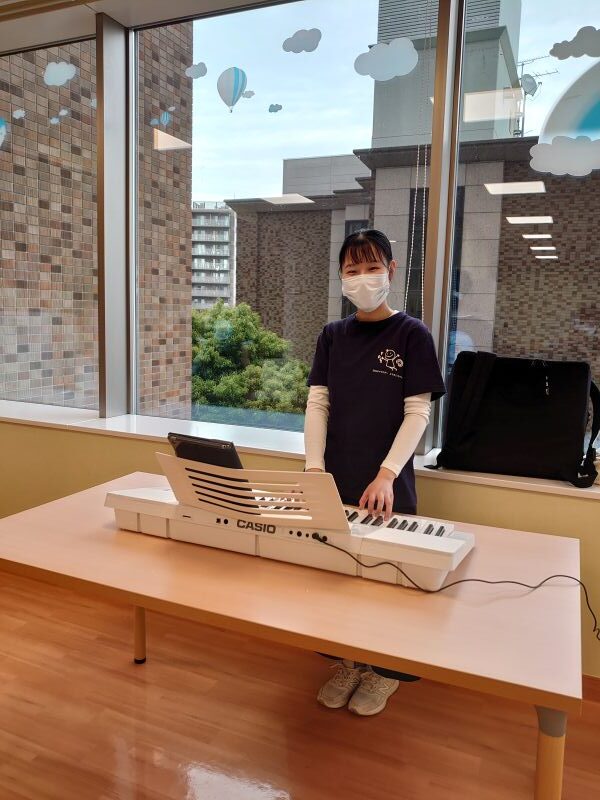30分ほど遊んだ後、2つの病室を回り、ベッドサイドで歌って遊びました。最初の病室で、歌っていてもあまり反応がなかった子が「うみのまつり」の「ハイ、ハイ、はい「0分ほど遊んだ後、2つの病室を回り、ベッドサイドで歌って遊びました。最初の病室で、歌っていてもあまり反応がなかった子が「うみのまつり」の「ハイ、ハイ、ハイ…」のところでニコッと笑ってくれたのがとても嬉しかったです。そのあと、何度も笑ってくれました。歌が終わると何度もベッドの柵をたたき、アンコールしてくれました。