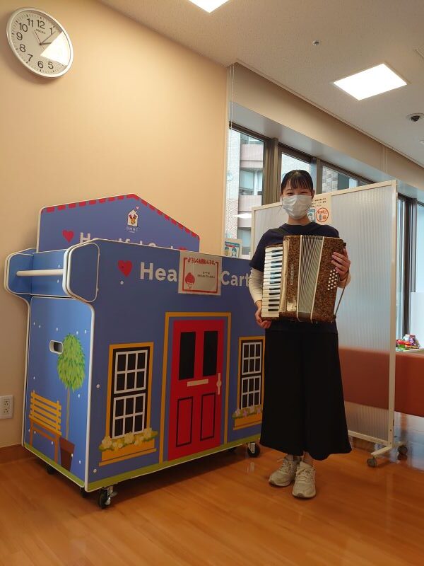 プレイルーム終了後は病室をまわり、ドアの外から音楽をお届けしました。マリオのリクエストでは、枕元にあったマリオのキャラクターの被り物をかぶって笑わせてくれ、思わず周囲も笑顔になる温かい場面がありました。また、別の病室から聴こえてきた曲に興味を持ち、「僕も聴きたい!」と新たにリクエストしてくれるお友達もおり、音楽が病棟全体へ広がっていく様子が感じられました。