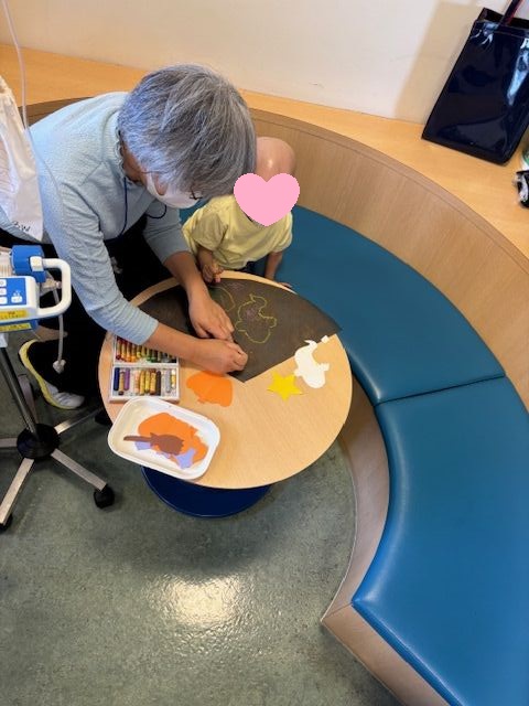 だんだん手が伸びてきて、なにか描くこと、できること、がわかってくると、表情が緩み笑顔も出て、目を見て受け入れてくれました。