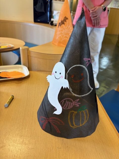 不織布の帽子に色画用紙のアイテムを追加することで小さいお子さんも自分で貼る作業ができて、年齢を問わず楽しめました。アーティスト三人のチームで、知恵を出し合うことで、その場にあった活動にすることができました。