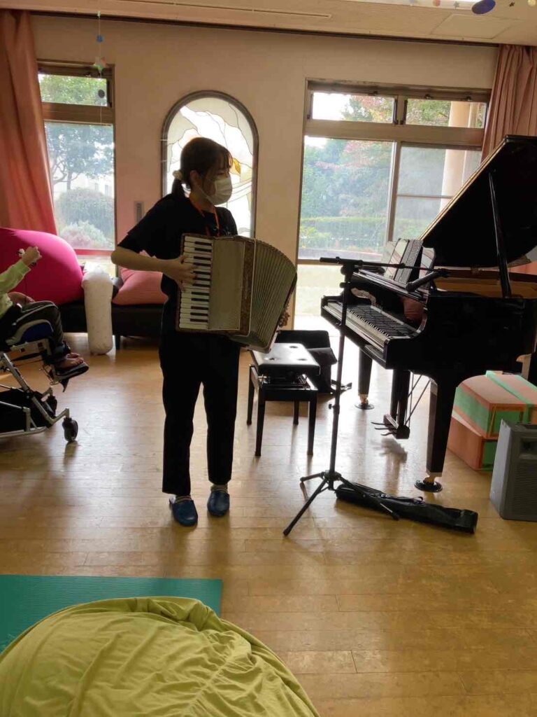 アコーディオンの演奏では、お友達のすぐ近くまで行き、呼吸や表情の変化を間近で感じながら演奏。じっとこちらを見つめてくれたり、目を輝かせてくれたり、その一瞬一瞬がとても嬉しかったです☺️