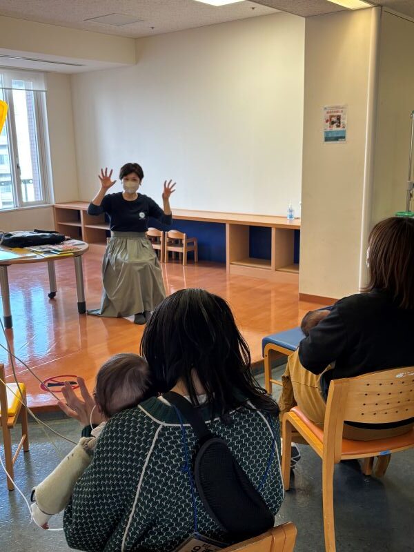 病室では個別にリクエストを聞いて読みました。入り口から遠くのベッドに向けて読んだり、複数のベッドから見てもらったりする際には、大型絵本が大活躍!産まれて数ヶ月の赤ちゃんに読んであげてほしいというご希望もあり、そういったお気持ちが素敵だなと感じました。