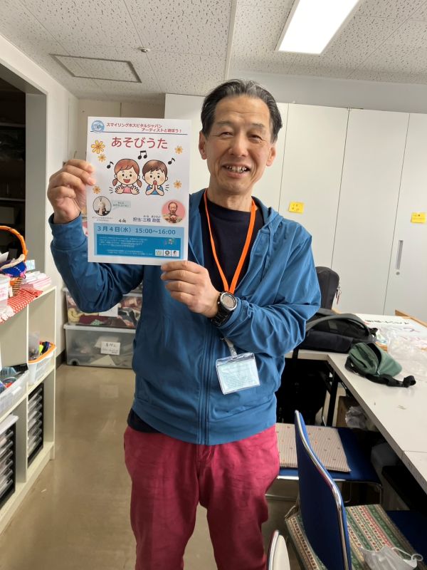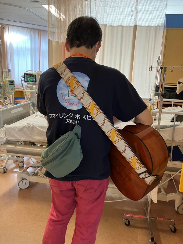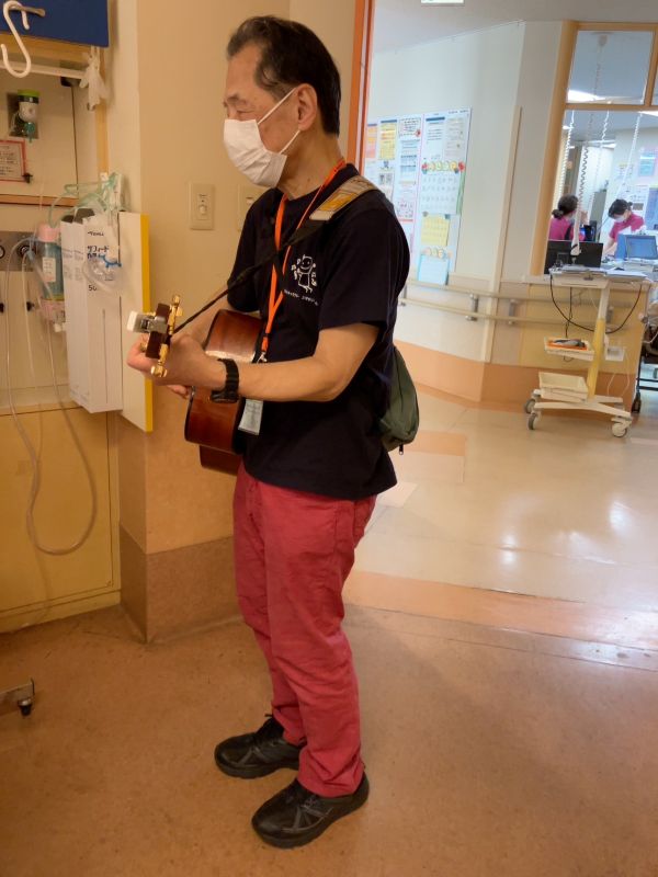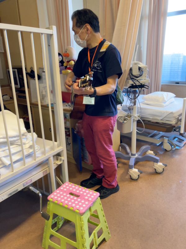 30分ほど遊んだ後、2つの病室を回り、ベッドサイドで歌って遊びました。最初の病室で、歌っていてもあまり反応がなかった子が「うみのまつり」の「ハイ、ハイ、はい「0分ほど遊んだ後、2つの病室を回り、ベッドサイドで歌って遊びました。最初の病室で、歌っていてもあまり反応がなかった子が「うみのまつり」の「ハイ、ハイ、ハイ…」のところでニコッと笑ってくれたのがとても嬉しかったです。そのあと、何度も笑ってくれました。歌が終わると何度もベッドの柵をたたき、アンコールしてくれました。